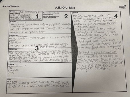 We used the A.E.I.O.U. Map to collect our contextual inquiry findings as it classifies data into Activities, Environment, Interaction, Objects, and User.