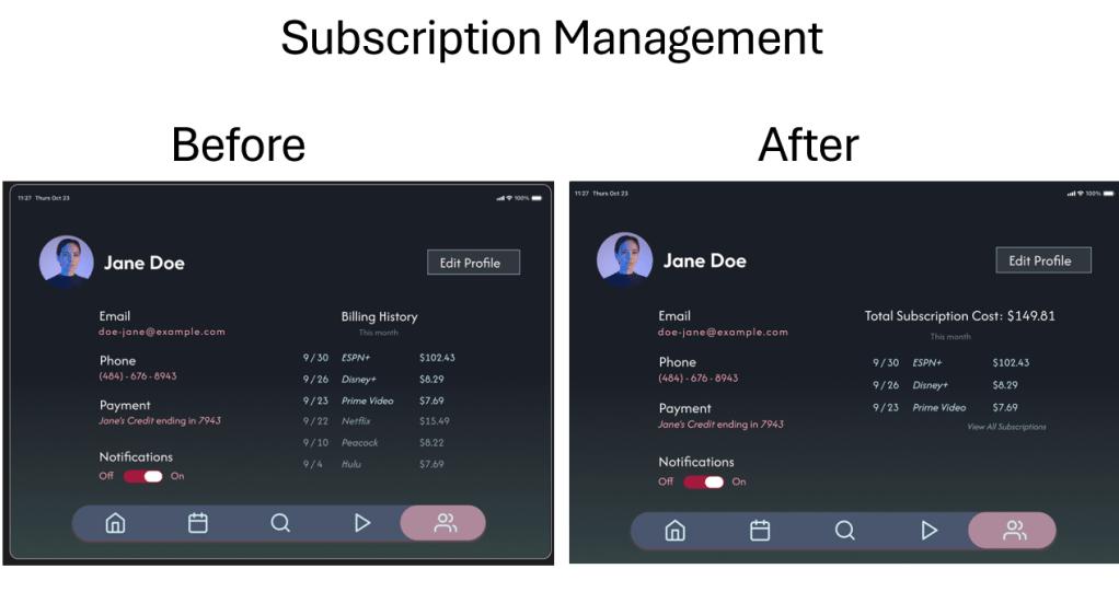 Our final project addresses this by bringing all viewing options into one place, organizing everything users are subscribed to and enhancing it with features like cross‑service search, a unified watchlist, subscription management, a calendar, and personalized short‑clip content navigation. Orbit creates a personalized experience that helps users understand what’s available to them based on their subscriptions and preferences, adding clarity and convenience to the streaming experience.