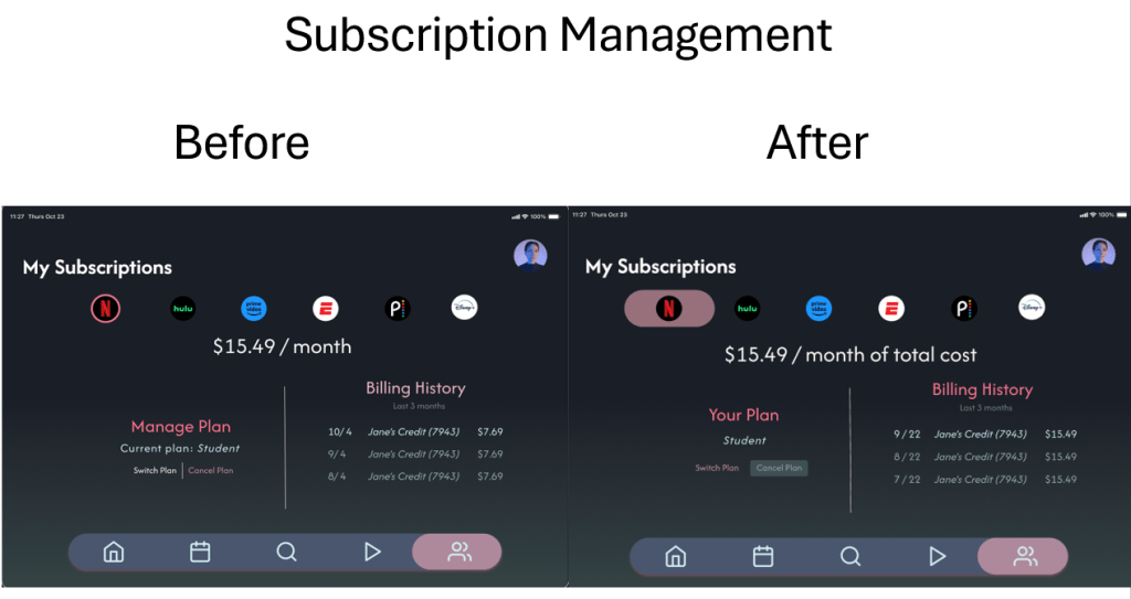 In our billing and account page, we received feedback that users wanted to see how much they were spending in total per month, on top of viewing the per subscription price, so we added that constant price to the billing page. We also elevated the visibility of the cancel and switch plan button after seeing that our users hadn’t even noticed them during testing.